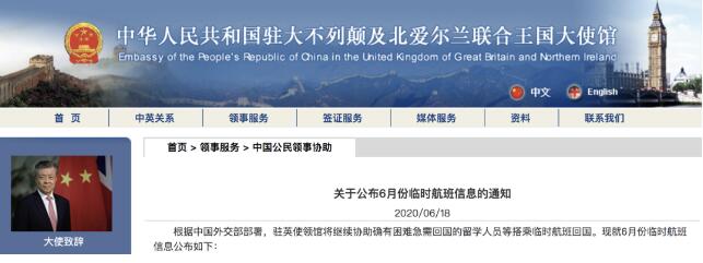 6月18日,中国驻英使领馆公布6月留学人员等临时航班信息及通知。