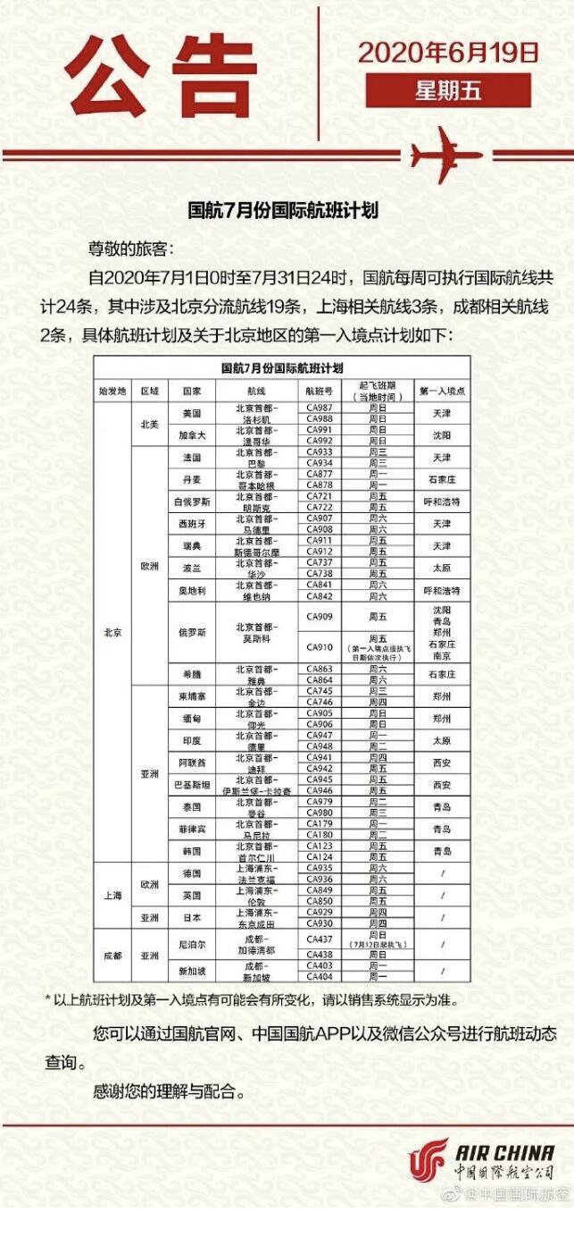 自2020年7月1日0时至7月31日24时,国航每周可执行国际航线共计24条,其中涉及北京分流航线19条,上海相关航线3条,成都相关航线2条。
